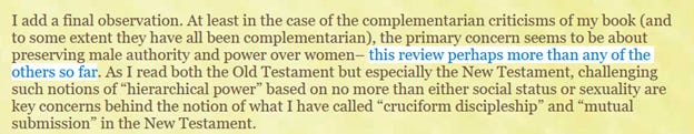 He gets in one last insult. And points explicitly to Chapter 7 of his BOOK, “Mutual Submission,” which he surely well knows I have not yet covered in my confrontation with his book.
