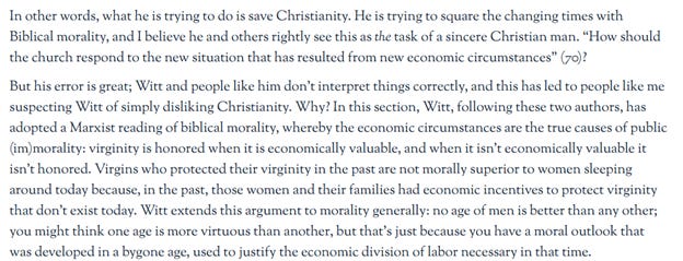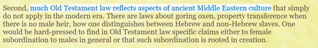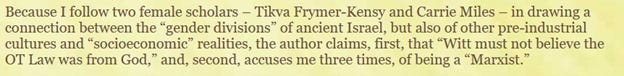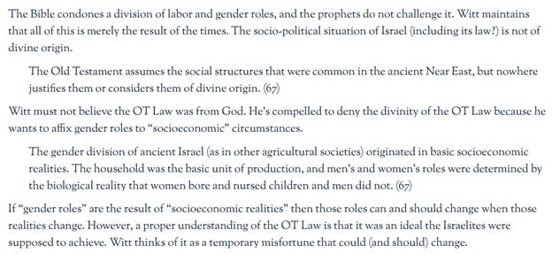 To summarize: Witt’s claim IN THE BOOK (67), is that there is no “divine origin” for gender roles because these roles were merely cultural. He claims that OT Laws, rather than being of a divine origin, are cultural. Which is why I wrote what I did.