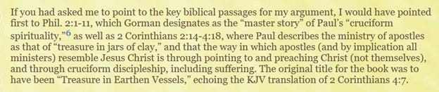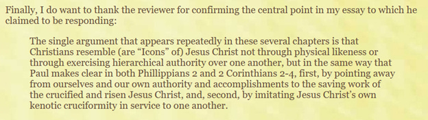Witt will suggest I think 3 times that I didn’t read his essay; he suggests that if I had I would have responded to the “key point” of the book: cruciform discipleship. But I was not writing an essay about his blog post, but about his book. The blog post he mentions made it easier to write the book because he states the key chapters of the book. Here is a quote from his blog post: