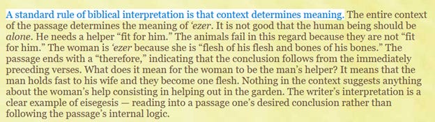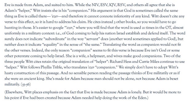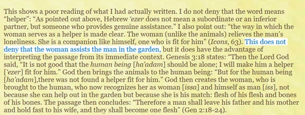 In my essay, I was arguing with his explicit claim IN THE BOOK that “companion” was a superior translation to “helper.” I will quote his own book. I quote: