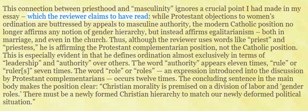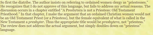 Most of my initial article was passed over in silence. He ignores my argument about Genesis 3:16 and my arguments about the necessity of a division of labor for the Christian priesthood.
