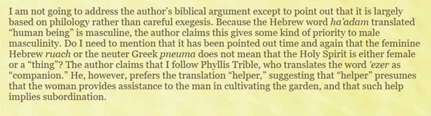 In my essay I go through each of his arguments for Genesis 1-3. Or, if not every one (maybe I missed one) just about every one. He has honed in on a single argument from Genesis 1, regarding the gender of the Hebrew word for God. He complains that he needs to point out “the feminine Hebrew ruach or the neuter Greek pneuma does not mean that the Holy Spirit is either female or a “thing”?” – I don’t know, why didn’t he make this argument in his BOOK and then I might eventually consider it in my essay?