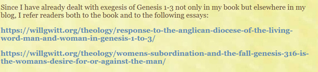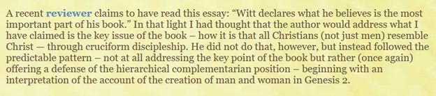 I set out to address the key chapters of his BOOK, one by one. And I state as much very clearly in my initial essay. Witt simply pretends like I’m trying to avoid “the key issue” because I’m a complementarian who is obsessed with Genesis 2. I only talk about Genesis 1-3 because that is part of what he covers in chapter 5. I don’t even consider myself a complementarian. Or: it’s not clear to me what a complementarian is.