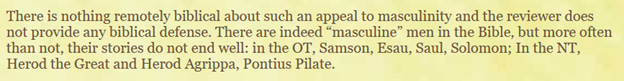 Why is there “nothing remotely biblical about such an appeal to masculinity” when there are, by Witt’s own admission “masculine men in the Bible” not all of whom are the “bad guys” listed.