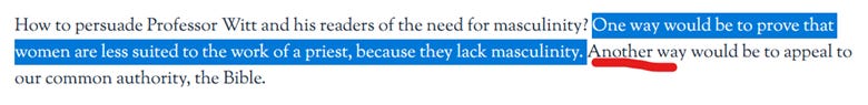 Witt even takes part of “my real argument” from this exact paragraph (the highlighted portion)—simply ignoring that I say there is another argument, namely, one from our common authority.