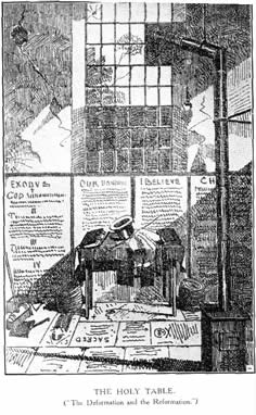 “But what a place he had to work in - a cold, damp church moudly and ruinous, with a font under the gallery full of rubbish, a mean table for an altar, with a threadbare altar-cloth, though of red velvet, thus bearing witness to the Old Sarum colors; box pews lined some with green, or red or blue baize, according to the taste or liveries of the various squires. A few texts on the whitewashed walls, which could be read by small eyes from the bottom of the pew, helping to check the wandering thoughts which were always started anew by some incident, or look, among the occupants of the family pew. A gallery occupied by irreverent, noisy singers, with their own tunes to Tate and Brady, and a clerk who gave out from over the King's arms the amount of poor-rate to be levied in the parish. No frequent communions, no baptisms in the church, no saint's-day services;” …(THE CHURCH QUARTERLY REVIEW, Vol. VI. April 1878, p. 190)
